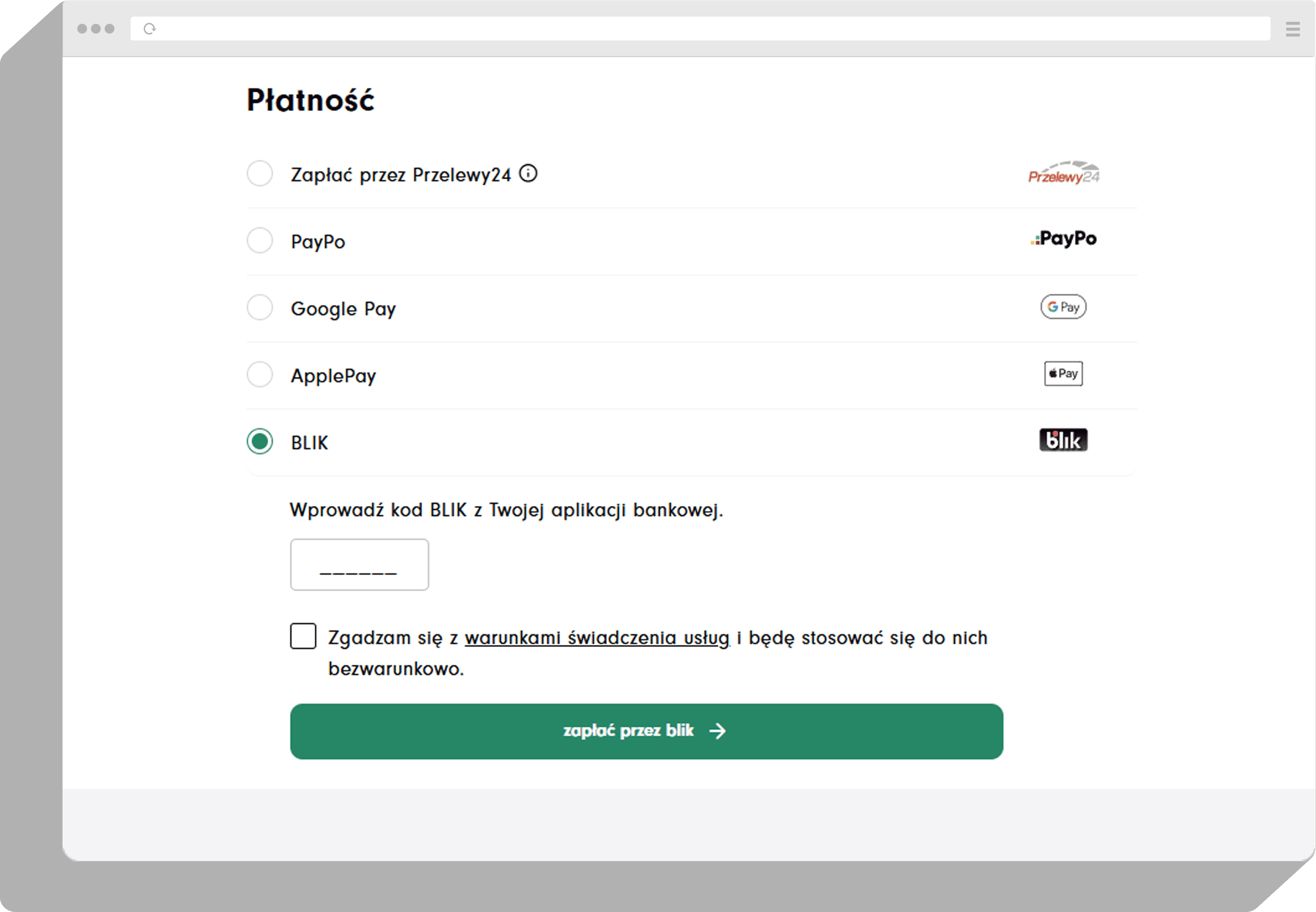 Klienci mogą wpisać kod BLIK bezpośrednio w koszyku, co eliminuje konieczność przechodzenia do dodatkowych stron płatności. Cały proces odbywa się w jednym miejscu, co pozwala na błyskawiczne zakończenie transakcji.
