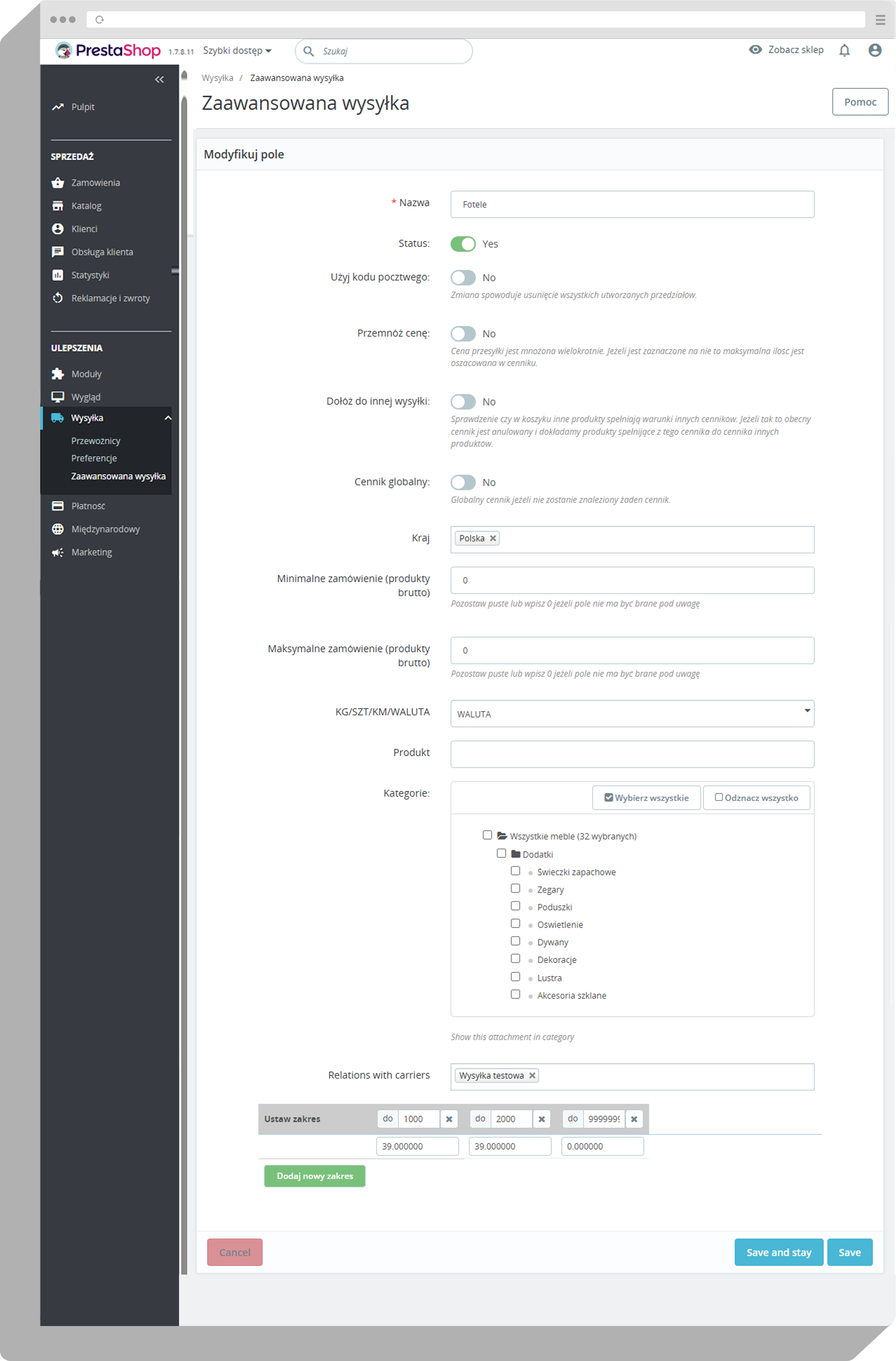 - Relations with carriers: – Zdefiniuj przedziały wartości lub wag i przypisz do nich odpowiednie stawki. Przykład: