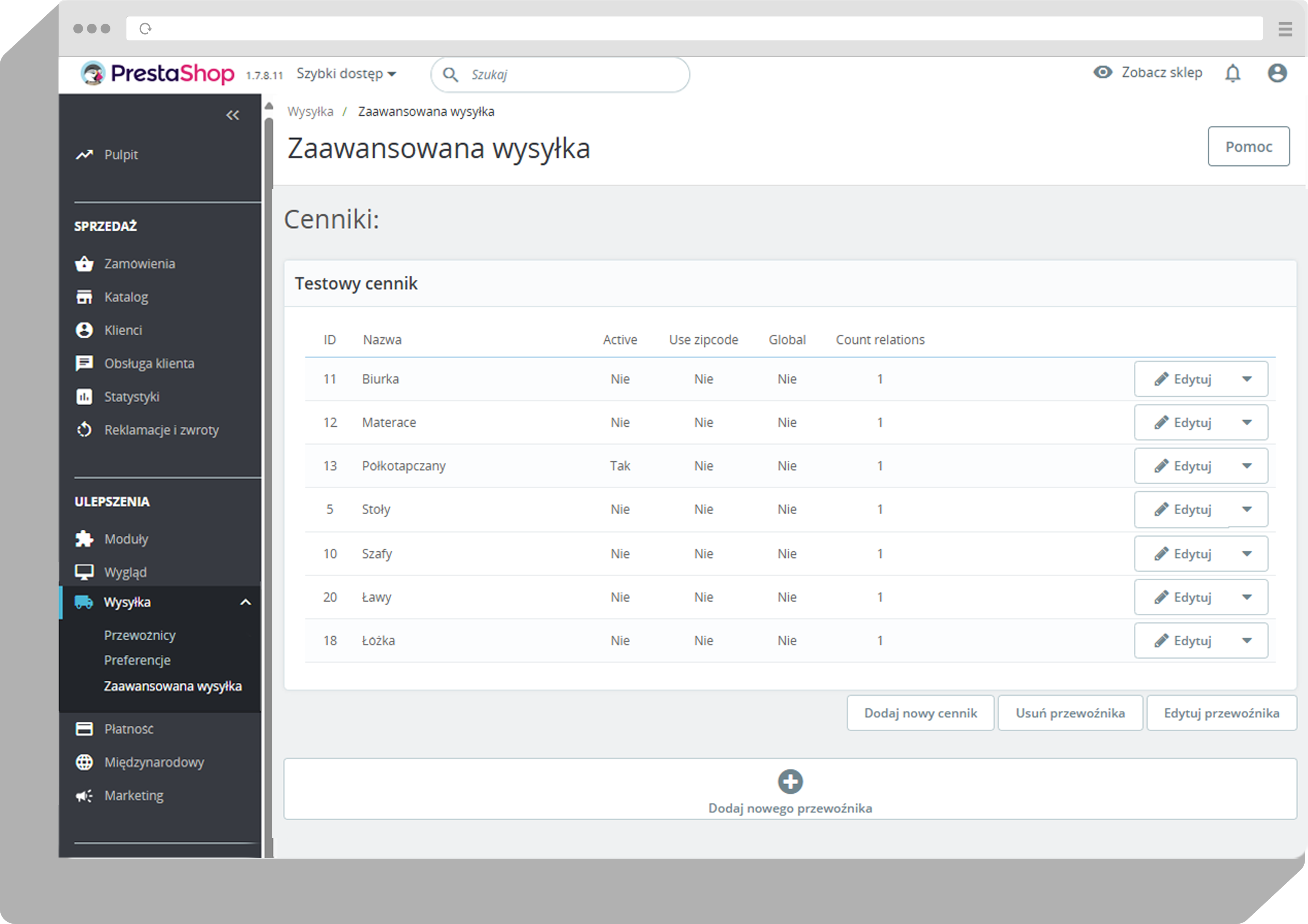 W tej sekcji tworzysz indywidualne cenniki dostawy, które będą dopasowane do konkretnych warunków: krajów, wagi, wartości zamówienia, kategorii produktów i więcej. Każdy cennik może działać samodzielnie lub w połączeniu z innymi.